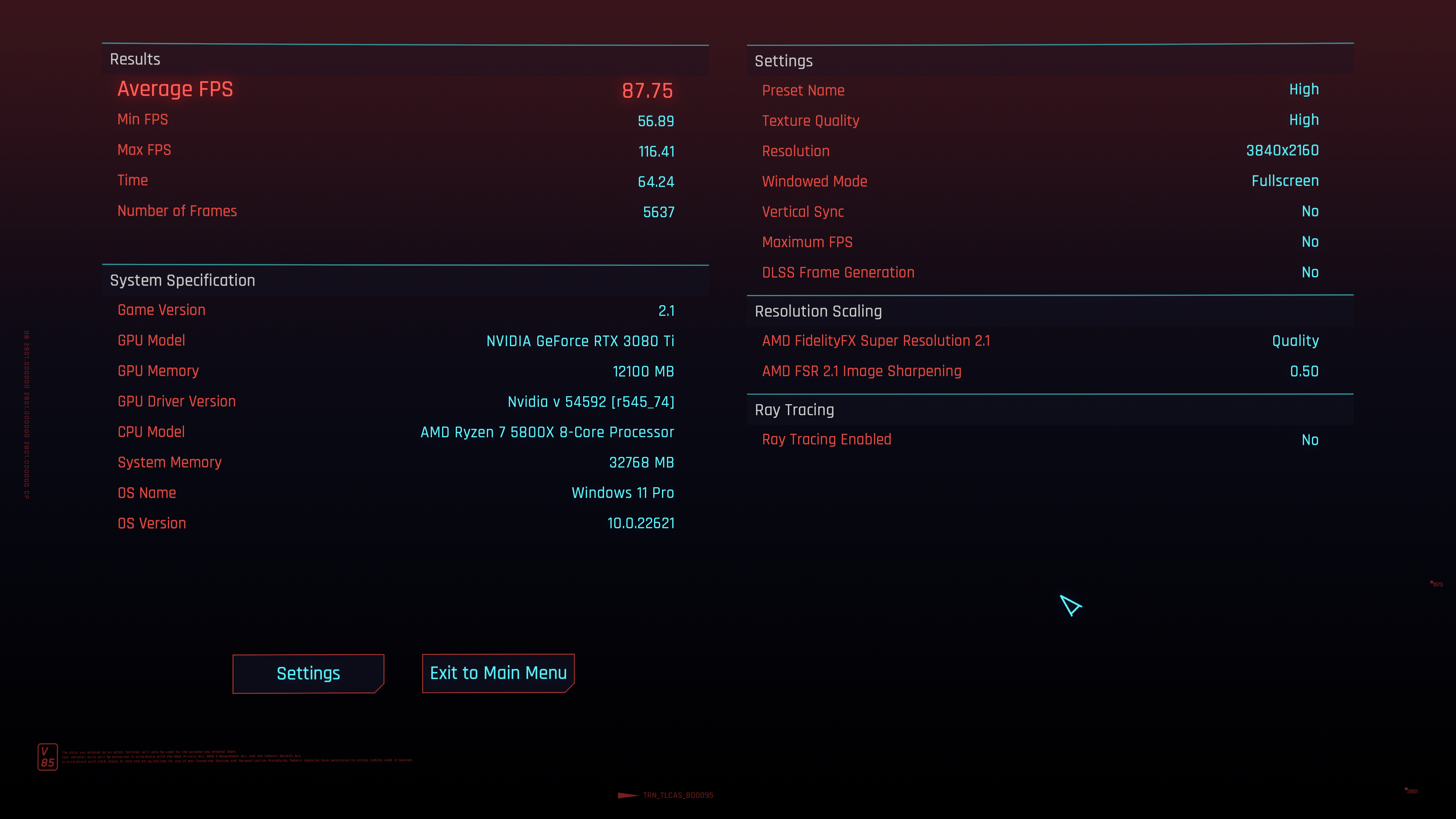 In game results of Cyberpunk 2077. Optimized defaults.